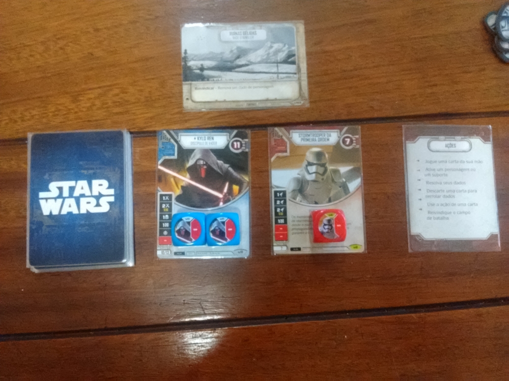 Star Wars: Destiny é composto por dois conjuntos iniciais - Rey e Kylo Ren, cada um com nove dados e 24 cartas - e os boosters Awakenings, cada um contendo um dado e cinco cartas.