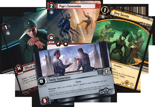 Fuja de olhos atentos em Between the Shadows, a terceira expansão de luxo para Star Wars: The Card Game. Esta expansão tem vinte e seis novos conjuntos de objetivos (duas cópias de cada um dos doze conjuntos de objetivos, e uma cópia de cada um dos dois "Limite de 1 por deck"), com foco nas filiações Jedi, Scum e Villainy. O Scum e Villainy usam as sombras para perseguir operações ilícitas e transações ilegais, enquanto o Jedi ficam nas sombras.