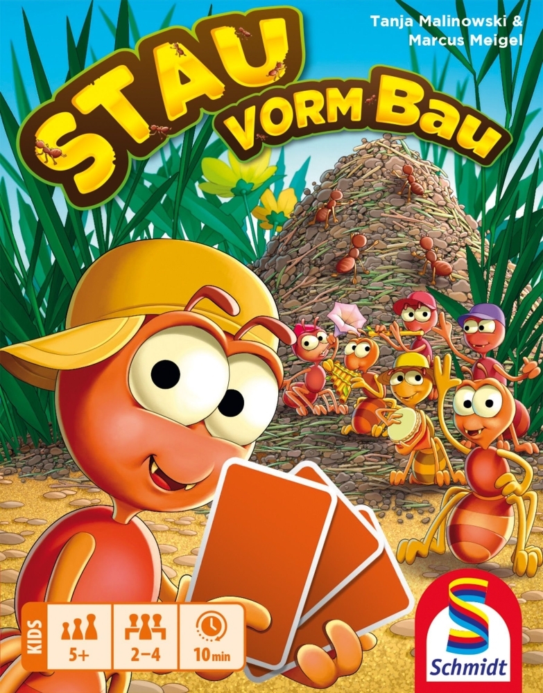 Em Stau vorm Bau, você se reveza colocando cartas de formiga em uma fileira e, de preferência, coletando pontos – ou outros jogadores podem se beneficiar da carta que você colocou. Quem tiver mais pontos no final do jogo vence.