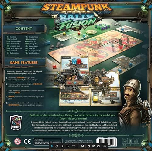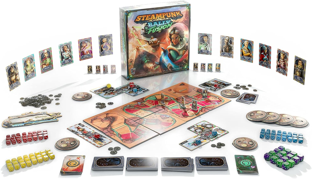 Steampunk Rally Fusion é um jogo autônomo que pode ser combinado com o Steampunk Rally original. Ele apresenta novas faixas com cartas de evento exclusivas, novas habilidades parciais (Gear Up e Overcharge) e um novo tipo de carta: Projetos Secretos. Ele também apresenta novos dados personalizados que representam a poderosa energia de fusão!