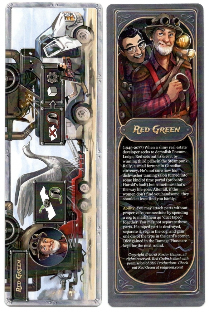 Red Green é um personagem promocional para Steampunk Rally. Em vez de ter os dois cartões padrão, um cockpit e uma máquina, o Red Green tem um único cartão 2 × 1 representando uma van e um dispositivo de reboque.