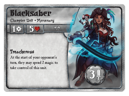 Após cada vez que esta unidade ataca, se todos os dados rolarem, um Blacksaber entra em jogo por um custo muito acessível para as estatísticas que ela possui. No entanto, dinheiro (ou magia?) fala aqui, e o controle dela pode mudar a qualquer momento se seu oponente estiver disposto a pagar para recrutar Blacksaber para o lado deles! Quem vencerá o Blacksaber no final? Você está disposto a correr o risco?