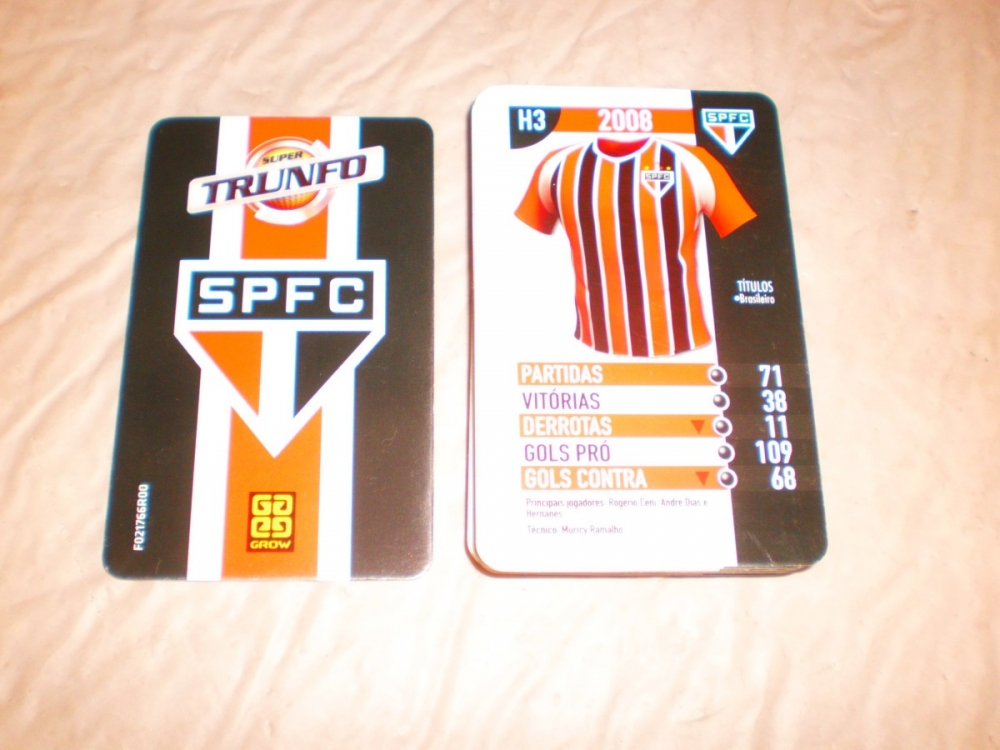 Versão do famoso jogo Super Trunfo, com camisas usadas em diversas épocas pelo time do São Paulo. Escolha uma característica; compare as cartas de todos os jogadores; e quem tiver o maior valor leva todas as cartas em disputa. Ganha quem conseguir todas as cartas.