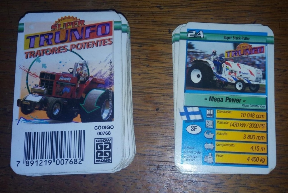 Versão do famoso jogo Super Trunfo, com o tema tratores potentes apresentando essas máquinas incríveis presentes das pistas de corrida às fazendas. Escolha uma característica; compare as cartas de todos os jogadores; e quem tiver o maior valor leva todas as cartas em disputa. Ganha quem conseguir todas as cartas.