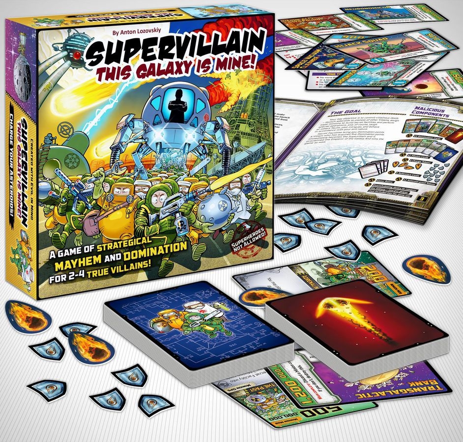 Supervillain: This Galaxy Is Mine! é um intenso jogo de estratégia baseado em cartas de dominação galáctica inspirado em todos os mundos de ficção científica reunidos e abastecidos com humor frenético. Cada jogador se torna um vilão e você tem que superar outros vilões e conquistar a galáxia! Para fazer isso, você usa dois baralhos de cartas universais - o baralho de dominação e o baralho de asseclas - e em cada baralho, cada carta pode ser usada de várias maneiras.