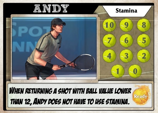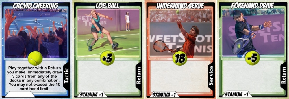 Existem três tipos de Baralhos no jogo: serviços, devolução e tática. Os jogadores têm de jogar a carta certa na situação certa. Mas cuidado - gestão de resistência é uma parte crítica do jogo! Se você não for cuidadoso o suficiente, você pode acabar sem ar muito rapidamente.