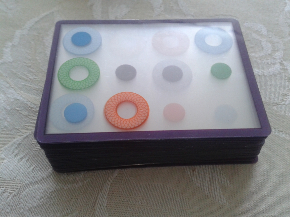 Parente próximo do SET, ou seja, é preciso reconhecer conjuntos de cartas em uma reserva. No entanto, aqui é preciso encontrar conjuntos de cartas onde círculos coloridos tenham seus centros preenchidos pela mesma cor. Tais círculos ficam em posições diferentes nas cartas, e cada carta tem sempre um círculo e (em outra posição) uma bolinha, correspondente a um centro de círculo. O interessante é que as cartas são transparentes, permitindo a sobreposição, e assim a identificação das correspondências. Outra particularidade: na hora de escolher as cartas, você tem que pensar nas posições (normal, 90º, 180º e 270º) e ainda nos "lados" da carta (frente ou verso). É de fundir o cérebro...