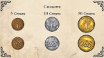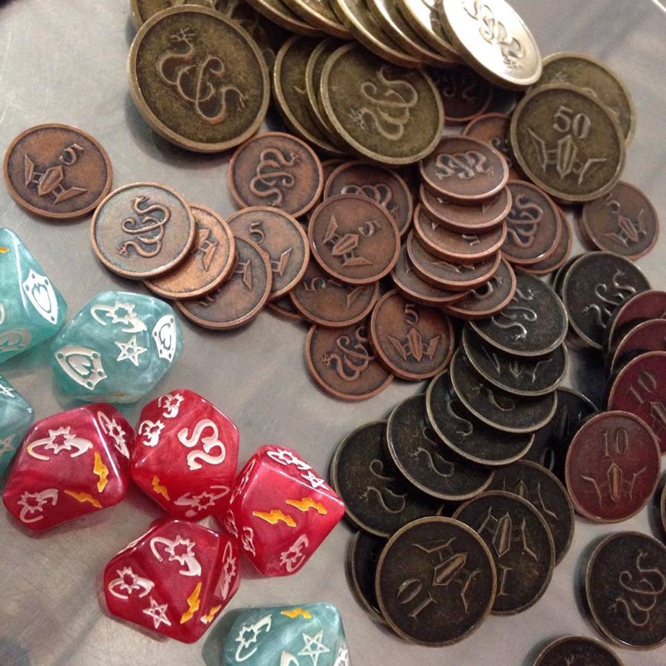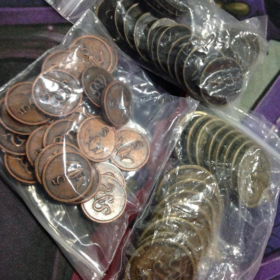 Este conjunto inclui 60 moedas de metal de alta qualidade, prontas para jogar. Este conjunto é temático do jogo Sword & Sorcery: Immortal Souls, ou pode ser utilizado como acessório em qualquer outro jogo de aventura de fantasia.