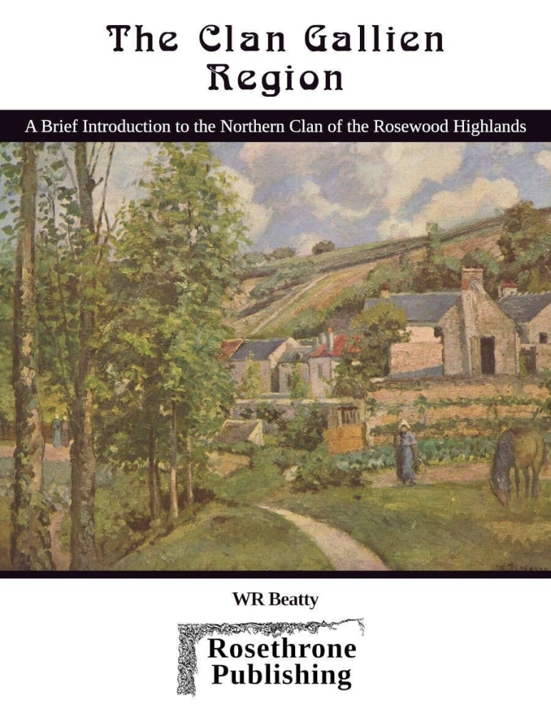 Este breve livro de fontes é uma visão geral da região do Clã Gallien, o clã mais ao norte dos Sete Pequenos Reis das Terras Altas de Rosewood. Reunidos aqui estão mapas mostrando os locais de todas as aventuras publicadas até agora pela Rosethrone Publishing, bem como 5 páginas de novas informações sobre a região com breves descrições de várias características significativas da propriedade do Clã Gallien.