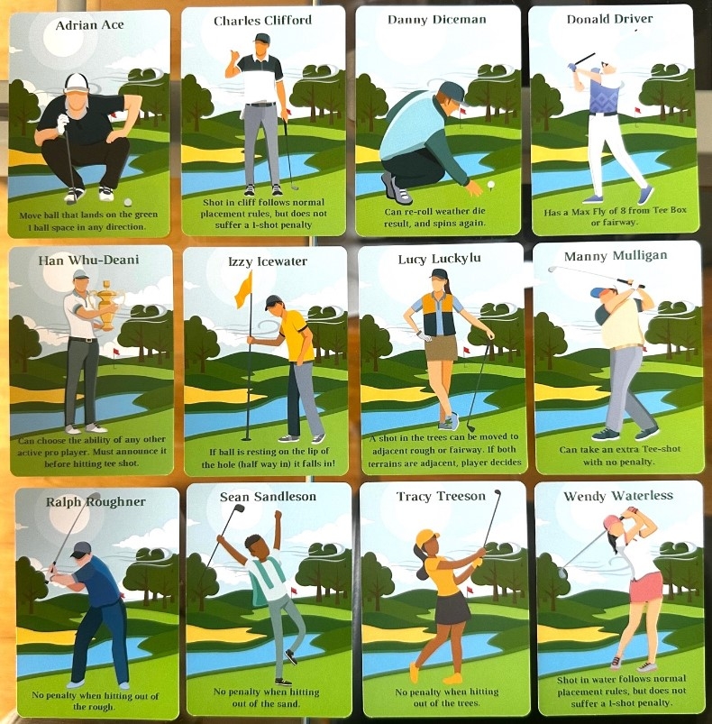 O jogo também inclui um dado meteorológico e um botão giratório que deve ser rolado antes de cada tiro para determinar a velocidade e a direção do vento. Cartas de jogador profissional de golfe, que os jogadores podem escolher ou distribuir aleatoriamente, cada uma tem uma habilidade diferente que os jogadores podem usar uma vez por buraco.