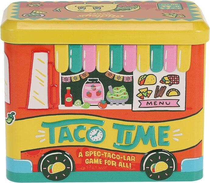 Taco Time é um jogo de dados e "force sua sorte" da Ridley's Games para 2 a 6 jogadores com mais de 8 anos. Os jogadores rolam dados para coletar cartas de comida e bebida combinando os ingredientes corretos com os pratos que desejam preparar. Quanto mais ingredientes corretos rolarem, mais difícil será para os outros jogadores desafiá-los. No entanto, rolar muitos ingredientes errados pode fazer com que os jogadores percam suas cartas. Cada carta de comida coletada rende pontos, com pontos de bônus por completar uma refeição inteira. O vencedor é o jogador com as cartas de maior pontuação em sua pilha. Taco Party é adequado para amigos, famílias e qualquer pessoa que ame tacos. Vem com 32 cartas de comida, 12 cartas de bebida, 8 dados de ingredientes e instruções, e tem um tempo médio de jogo de 30 minutos. Impresso em papel FSC e com tintas de soja.