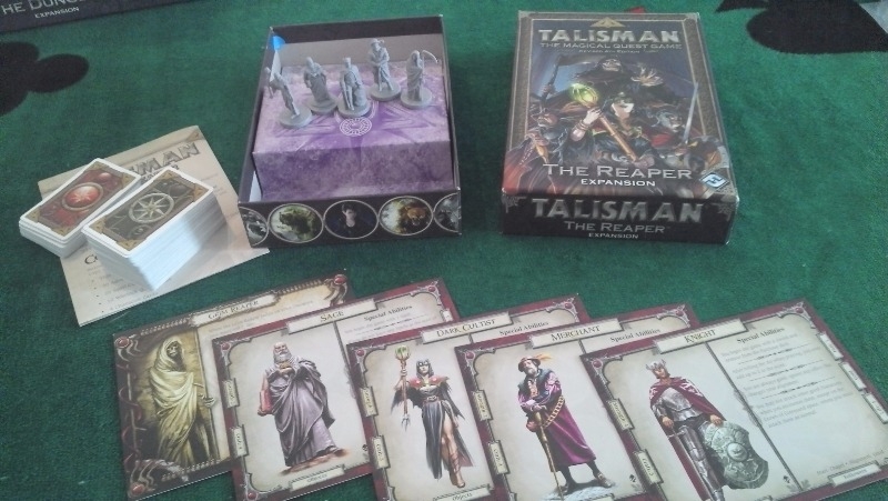 A expansão The Reaper oferece aos jogadores de Talisman 4 novos personagens com figuras de plástico (Dark Cultist, Sage, Knight and Merchant), 90 novas Cartas de Aventura, 26 novas cartas de Magia, 12 Warlock Quest Cards e The Grim Reaper, uma figura escura que os jogadores manipulam um contra o outro.