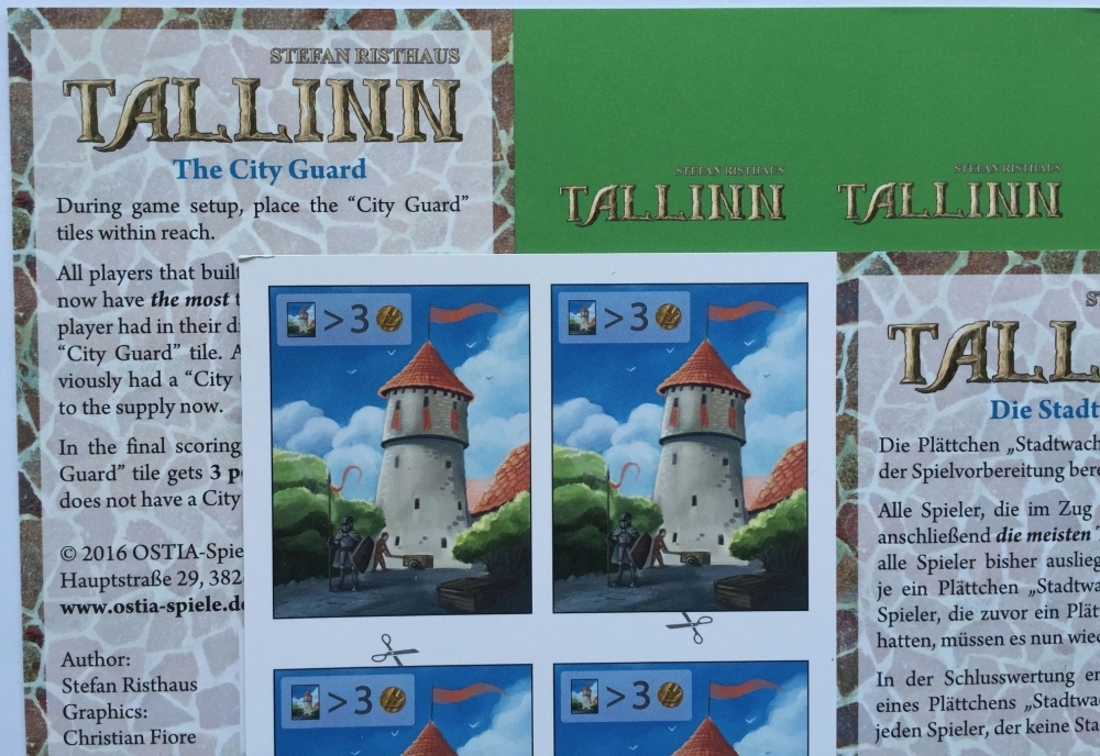 Tallinn: The City Guard é uma expansão de cartão postal para Tallinn que consiste em quatro fichas que precisam ser cortadas do cartão.