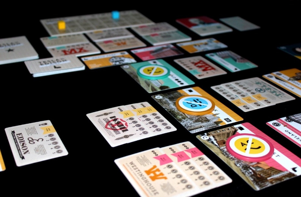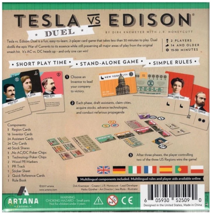 Tesla vs Edison: Duel é um jogo de cartas de 15 a 30 minutos que leva a "Guerra das Correntes" a um jogo fácil de aprender, rápido, mas muito estratégico. Os jogadores assumem o controle de Nikola Tesla ou Thomas Edison e criam uma empresa que reivindica projetos em regiões ao redor dos Estados Unidos, avança as últimas tecnologias, se envolve em uma guerra de propaganda em torno de tecnologias de CA e CC e compra ações em empresas de eletricidade menores. Durante o jogo, os jogadores trazem luminárias famosas, onde cada uma oferece ações e habilidades únicas em sua empresa. O vencedor é a empresa que ganha dois dos três principais sistemas: controlar regiões com projetos, estar à frente da corrida PR e manter o portfólio de ações mais valioso. Tesla e Edison, cada um têm uma condição especial de vitória que os jogadores podem desencadear durante o jogo para vencer de imediato.
