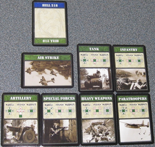 The Battle for Hill 218 é um jogo de cartas de estratégia da Your Move Games no qual os jogadores lutam para controlar uma colina ocupando "bases" imaginárias com cartas representando diversos tipos de tropas.