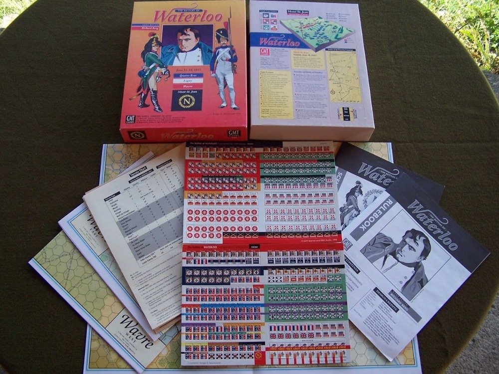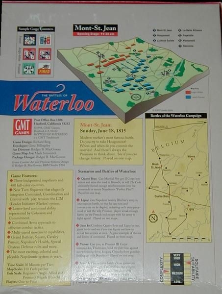 As Batalhas de Waterloo da GMT cobrem quatro grandes batalhas durante a campanha de Waterloo: Mont Saint Jean, Quatre Bras, Ligny e Wavre em um pacote, além de um jogo de campanha. Existem 3 mapas incluídos, mas apenas o jogo de campanha precisa de todos os três. Cenários requerem um a dois mapas.