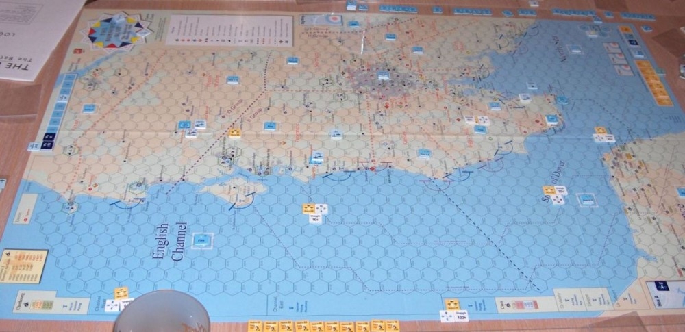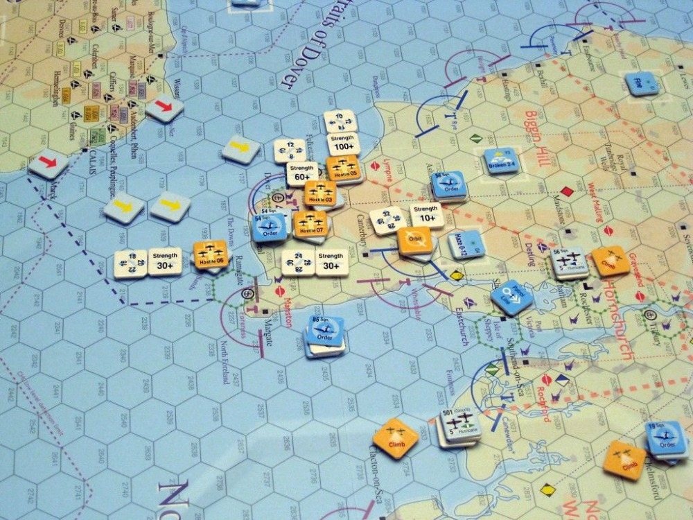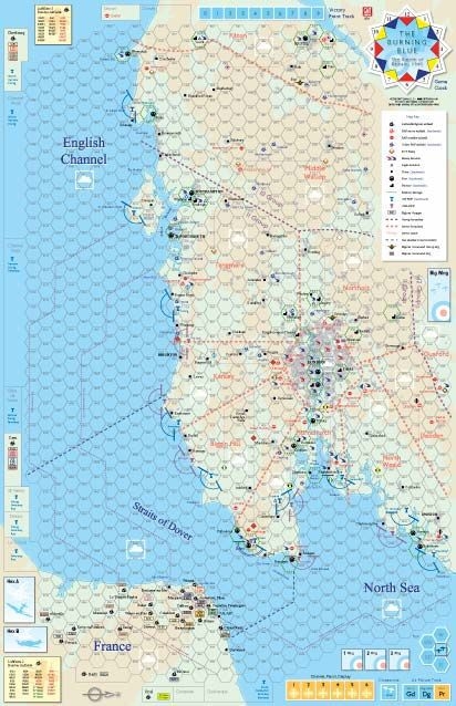 Começando com a luta acima dos comboios no Canal e terminando com o assalto em Londres e a ofensiva caça-bombardeiro, The Burning Blue simula batalhas entre o poder aéreo alemão e do sistema de defesa aérea britânica. Ele recria o tenso minuto a minuto de batalhas entre os controladores de combate da RAF e os ataques aéreos da Luftwaffe.