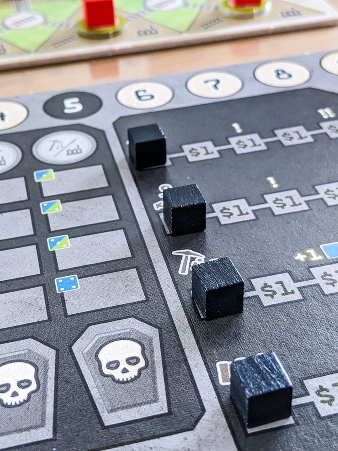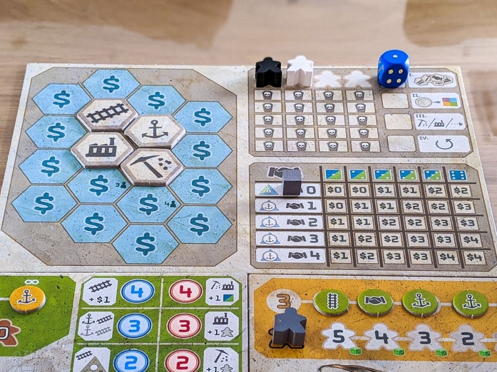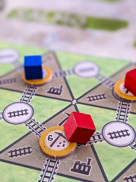 • 6 action markers (2 mine actions, 2 rail actions, 1 mill action, 1 port action)