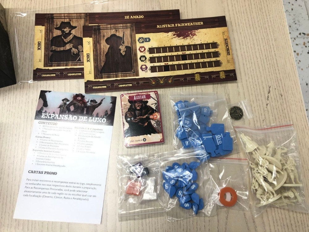 The Few and Cursed: Expansão de Luxo adiciona dois novos personagens, Alistair Fairweather e Ze Amado, expandindo o jogo para até 6 jogadores. Alistair é outro pistoleiro que rivaliza com a Ruiva e detesta o sobrenatural. Ze Amado é um ladrão ágil que depende de sua forma amaldiçoada para impulsionar seus ataques. Esta caixa também traz componentes aprimorados, a expansão Imortais Caídos, mais recompensas, novos encontros e cartas promo adicionais para ampliar ainda mais sua experiência com o jogo base.