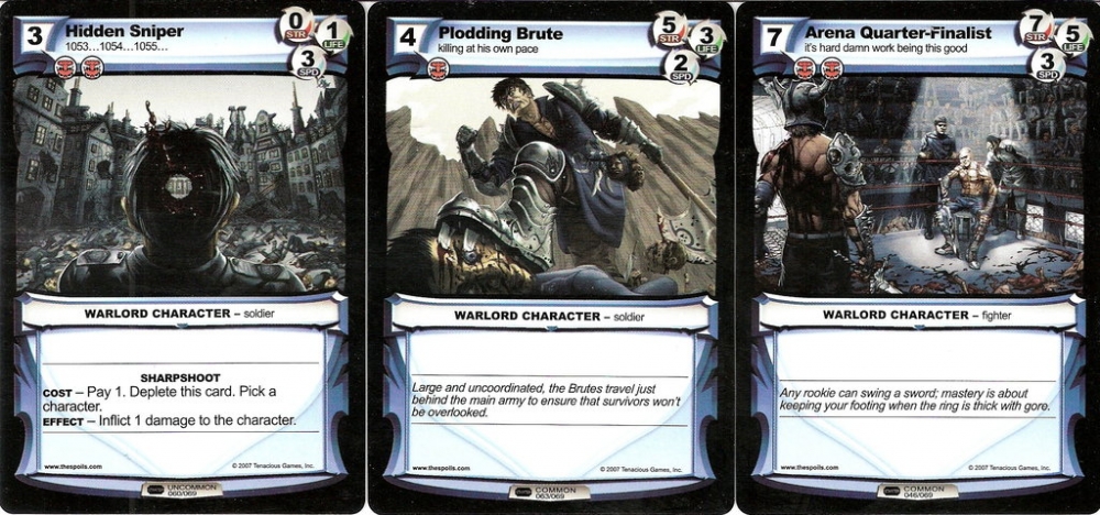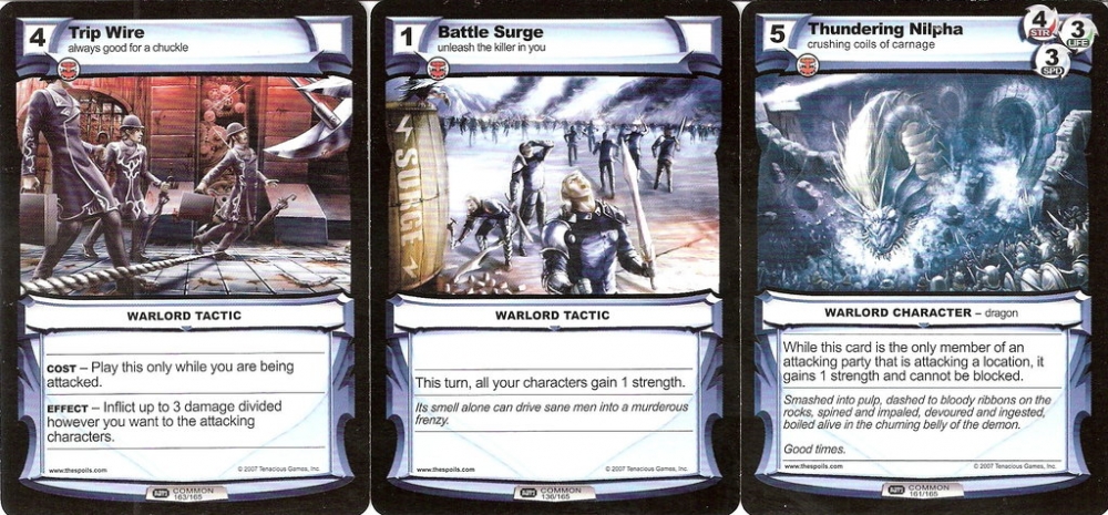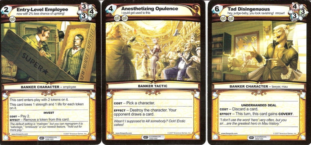 The Spoils, um jogo de cartas lançado pela primeira vez em 2006 pela Tenacious Game, é semelhante com outros jogos de cartas, como Magic: The Gathering e Magi-Nation para alguns de seus mecanismos de jogo. Você começa o jogo com uma figura ou carta de facção que determina o seu turno e quais as ações que está autorizado a tomar. Estas facções têm habilidades especiais, exclusivas para cada carta de facção.