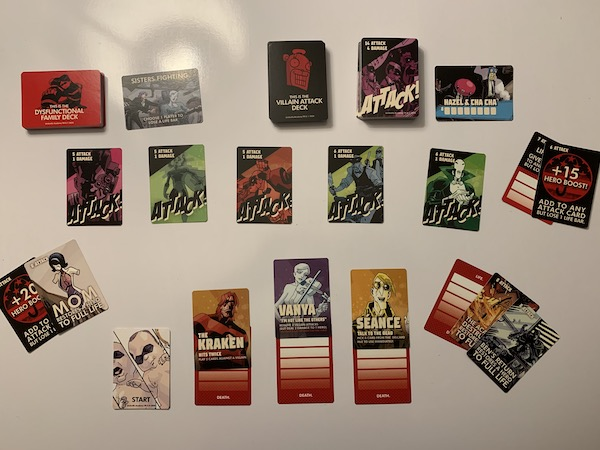 No jogo, cada jogador escolhe seu membro da família favorito para atuar como seu cartão de herói e, em seguida, coloca um cartão de vida abaixo dele. Cada jogador recebe cinco cartas de ataque de herói. Embaralhe as cartas do vilão e coloque-as no meio da área de jogo. Coloque o baralho de cartas de ataque do vilão e o baralho de cartas familiares disfuncionais ao lado das cartas do vilão. Coloque as cartas de batalha finais de lado.