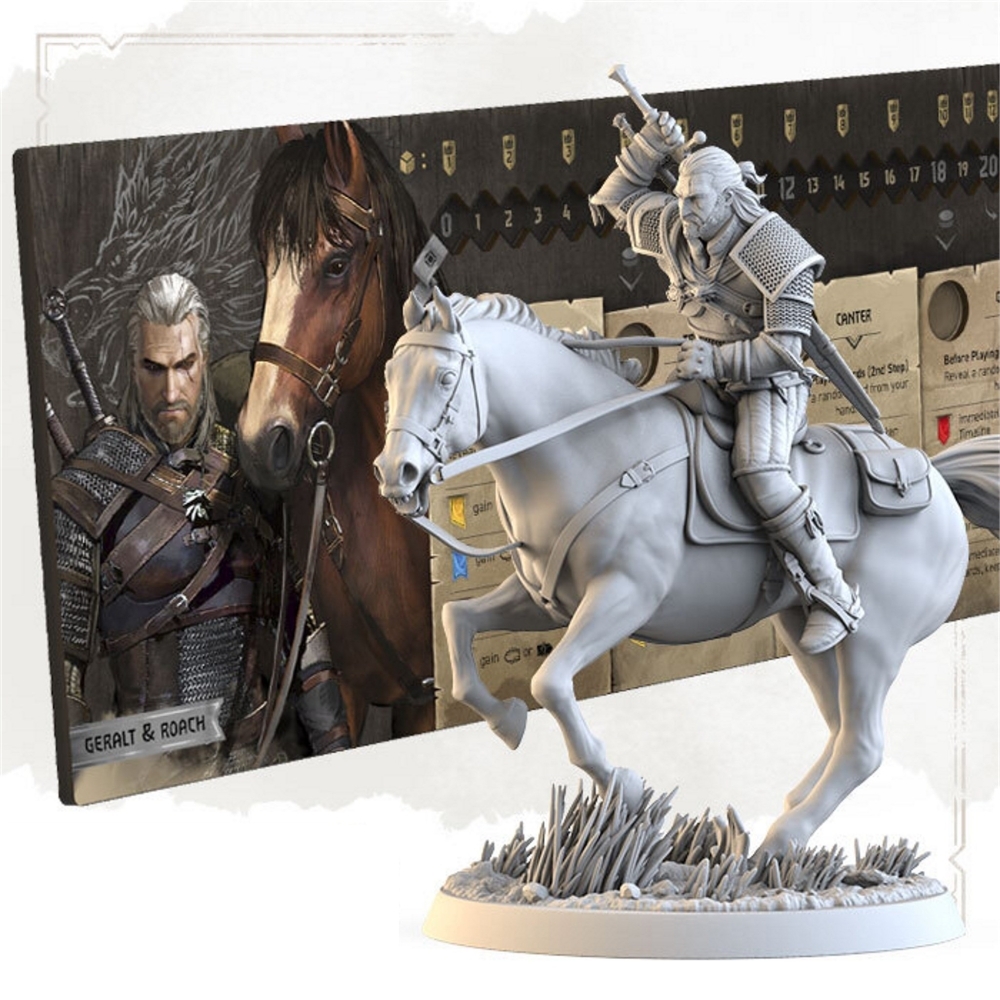 Ele é chamado de “Presente do Primeiro Dia” por uma razão. Essa expansão contém 1 miniatura magistralmente esculpida de Geralt montado em Carpeado (Roach) e 1 tabuleiro de jogador, com dupla camada.