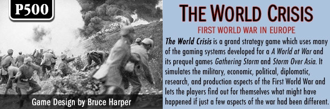The World Crisis é um grande jogo de estratégia que usa muitos dos sistemas de jogo desenvolvidos para A World at War e seus jogos prequel Gathering Storm e Storm Over Asia . Ele simula os aspectos militares, econômicos, políticos, diplomáticos, de pesquisa e produção da Primeira Guerra Mundial e permite que os jogadores descubram por si mesmos o que poderia ter acontecido se: