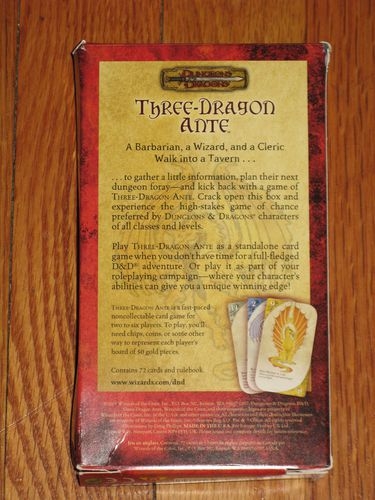 Three-Dragon Ante é um jogo de cartas não colecionável baseado nos jogos de taverna desempenhados pelos personagens dentro do mundo do jogo de D&D. Three-Dragon Ante pode ser jogado como um jogo de cartas independente quando não há tempo suficiente para uma aventura completa de D&D, ou ele pode ser jogado como parte de um RPG de campanha onde as habilidades de um personagem podem influenciar no jogo.