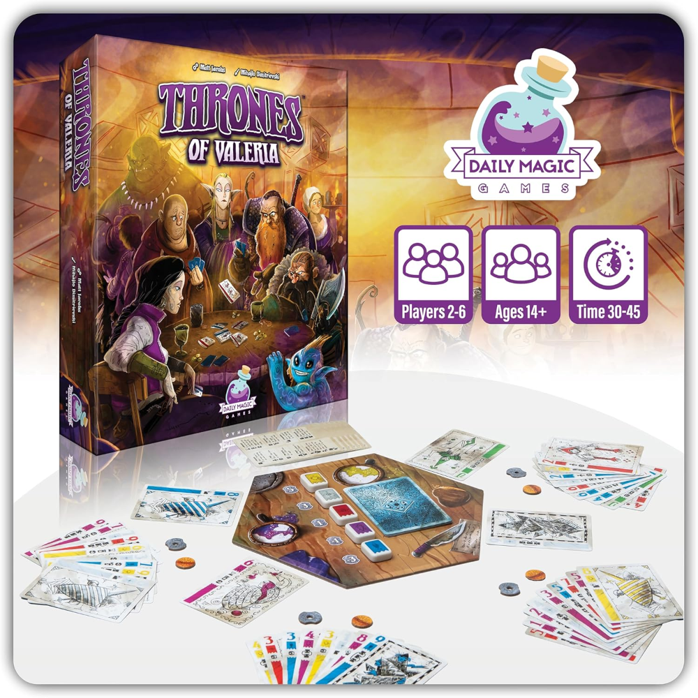 Há muito tempo, quando o reino era incipiente, as cinco Grandes Casas da Valéria estavam constantemente brigando, roubando, conspirando e até mesmo assassinando umas às outras - tudo pela chance de se tornar a Casa mais rica e poderosa do Reino! Thrones of Valeria evoluiu dessas lutas de poder e prosperou entre as pessoas comuns que procuram experimentar o cabo de guerra dos nobres. Hoje, é o tipo de jogo que os viajantes jogam nas tabernas por diversão e dinheiro.