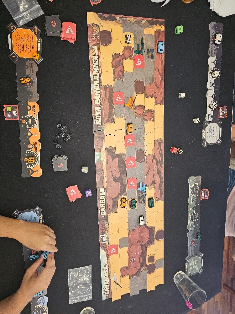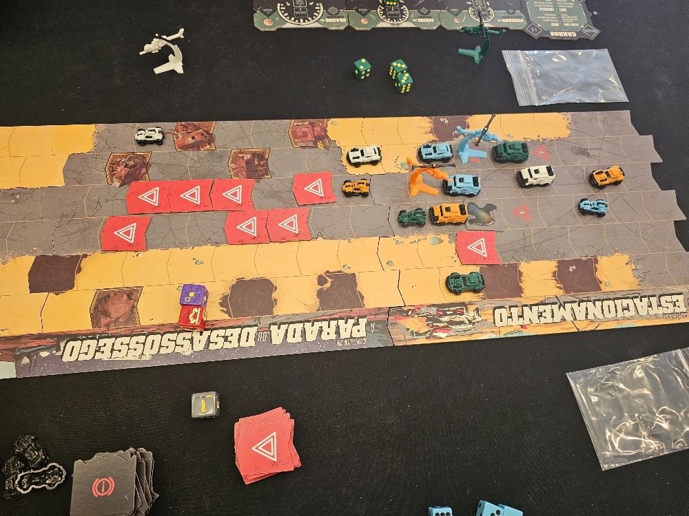Esta nova versão apresenta novas adições emocionantes, incluindo tokens de perigo aleatório, como destroços, manchas de óleo e muito mais. O dano não é apenas um efeito. Agora, você receberá tokens de dano com efeitos emocionantes que podem fazer seu carro derrapar. Você também terá mais opções no seu turno, atribuindo um de seus dados ao seu quadro de comando para reparar danos, aumentar o nitro ou enviar seu helicóptero de ataque para disparar.