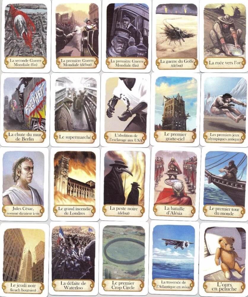 Timeline: Historical Events é um jogo que faz uso de 110 cartas. Cada carta retrata um evento histórico em ambos os lados, e o ano em que ocorreu em apenas um deles. Os jogadores, em turnos, colocam uma carta de sua mão em uma fila na mesa. Após colocá-la o jogador revela a data na carta. Se a carta foi colocada corretamente em ordem cronológica em relação às outras cartas já presentes na mesa, ela é deixada lá. Caso contrário, a carta é removida de jogo e o jogador deve comprar uma nova carta do deck.