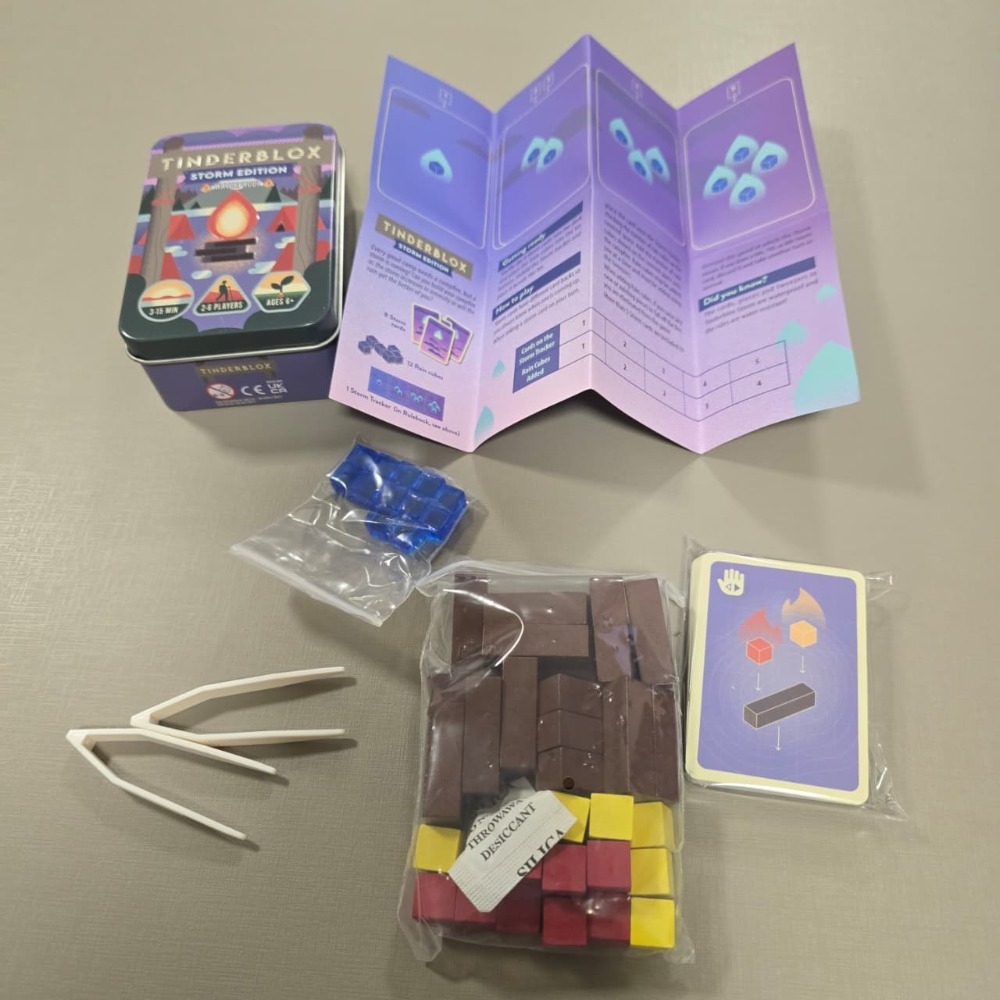 Compre um cartão e use sua pinça para adicionar o que é mostrado à fogueira crescente. Cuidado, se você derrubar o fogo, você está fora! Seja o último jogador sobrevivente para provar que você é o melhor campista. Leve o Tinderblox com você para qualquer lugar! Um mini jogo de lata que cabe no seu bolso.