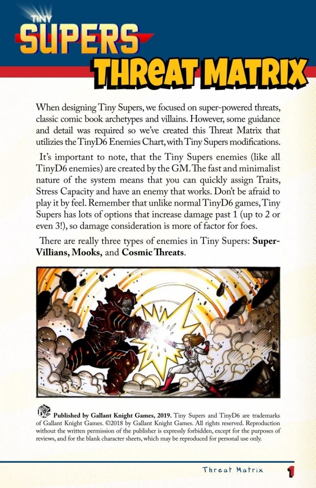 Ao projetar Tiny Supers, nos concentramos em ameaças superpoderosas, arquétipos clássicos de quadrinhos e vilões. No entanto, algumas orientações e detalhes foram necessários, então criamos esta Matriz de Ameaças que utiliza o Gráfico de Inimigos TinyD6, com modificações em Tiny Supers.