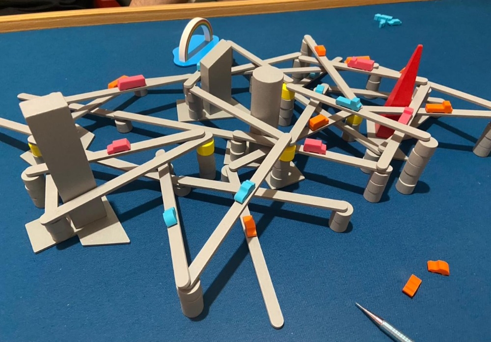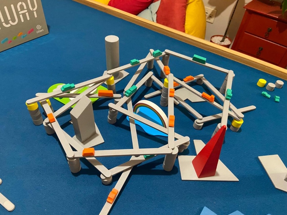 Em seu turno, expanda sua rodovia adicionando uma nova vareta na extremidade dela. Ao fazer isso, uma extremidade da vareta é colocada na coluna que suporta a vareta jogada anteriormente, e a outra extremidade vai para uma nova coluna que você adiciona à mesa; essa nova coluna deve conter uma peça a mais ou a menos do que a coluna na outra extremidade da vareta. (Se você criar uma coluna com uma peça amarela no topo e pelo menos uma peça abaixo dela, pode ignorar essa regra de restrição de altura.)