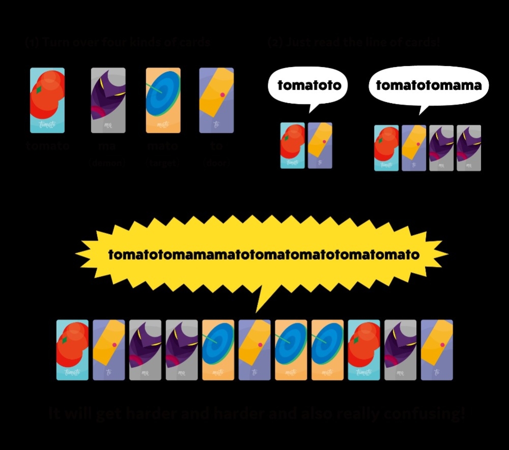 TomaTomato quatro diferentes tipos de cartas — Tomato, Mato, Ma, To — das quais você irá virá-las e alinhá-las uma a uma, e depois, você deve ler a linha inteira do começo ao fim. No começo você acaba lendo apenas uma palavra como "Tomato", mas rapidamente a dificuldade de ler aumenta fazendo você enrolar a língua como em "Tomatotomatomama!" Soa maravilhoso quando você consegue ler corretamente e hilariante quando não consegue.