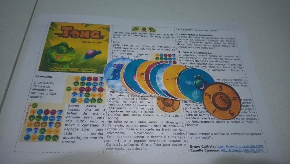 Tong é um jogo para 1 ou 2 jogadores oferecido gratuitamente como print & play por seu autor, Bruno Cathala, como agradecimento pela vitória no concurso do site francês de games Tric-Trac.