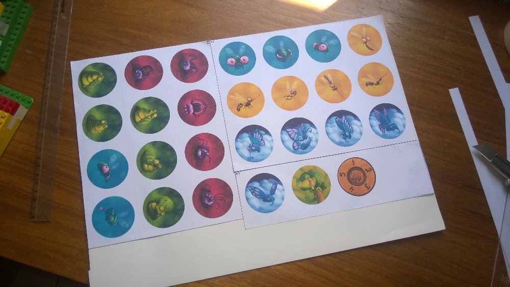 26 fichas de jogo, sendo um camaleão e 25 insetos;