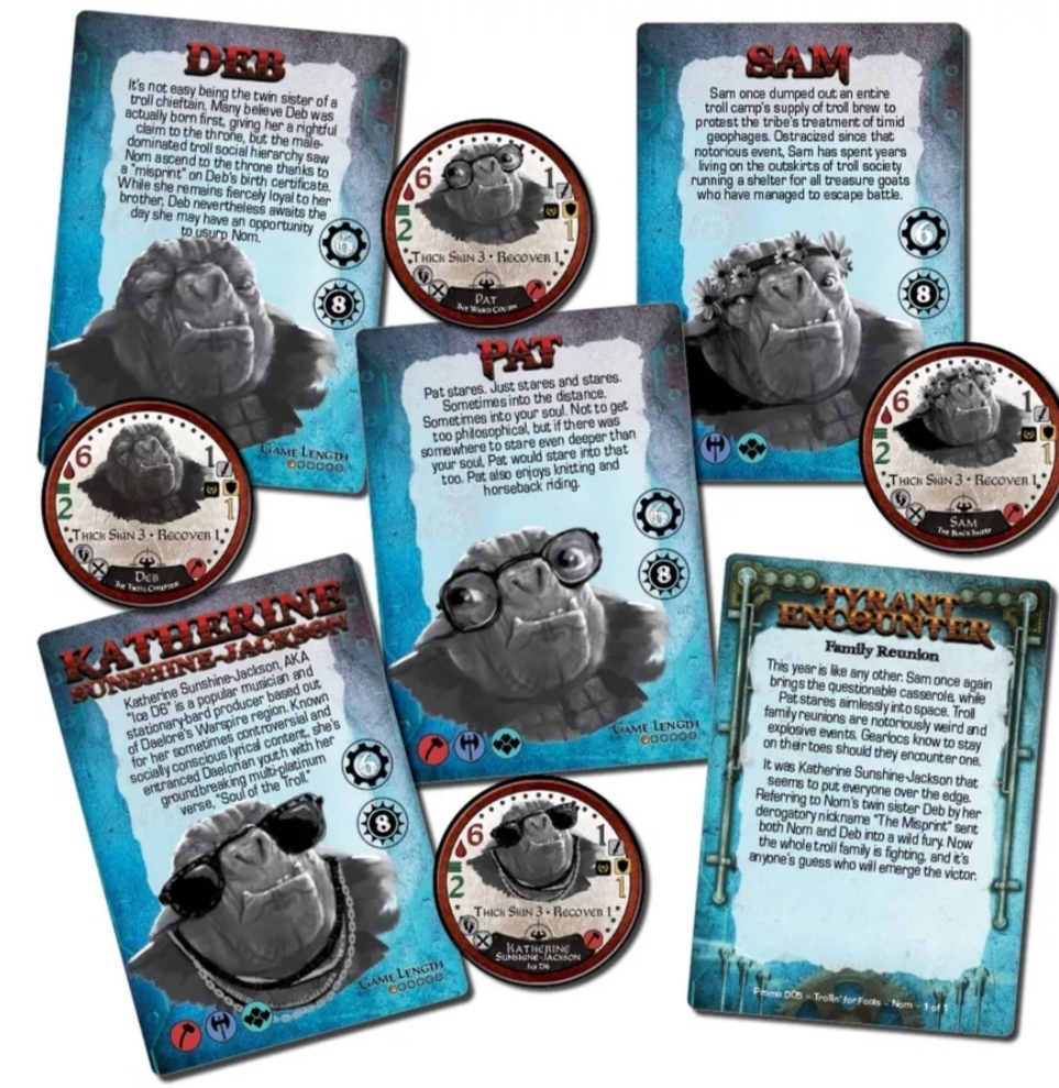 Nunca que nos levamos muito a sério, aproveitamos uma circunstância infame (e bem-humorada) e corremos com ela. Esta é sua chance de obter o indescritível chip de erro de impressão "Deb" para sua cópia mais antiga (ou mais recente) de Too Many Bones! Mas por que parar aí? Fomos em frente e colocamos a piada no chão (e mais um pouco) criando uma família inteira de tiranos trolls para você lutar.