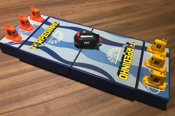 Neste jogo você tem um torpedinho movido a corda (do tipo Patotinha). Você seleciona um ângulo de ataque no arco disponível no seu campo de ataque fazendo a mira para atingir e derrubar o submarino inimigo da plataforma à frente. Aquele que derrubar todos os submarinos adversários primeiro, é o vencedor.