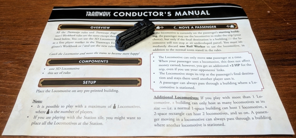 O Tramways Conductor's Manual, uma expansão para o jogo Tramways e o Tramways Engineer's Workbook, vem com uma locomotiva 3D (aproximadamente 4,5 cm) e a folha de regras.