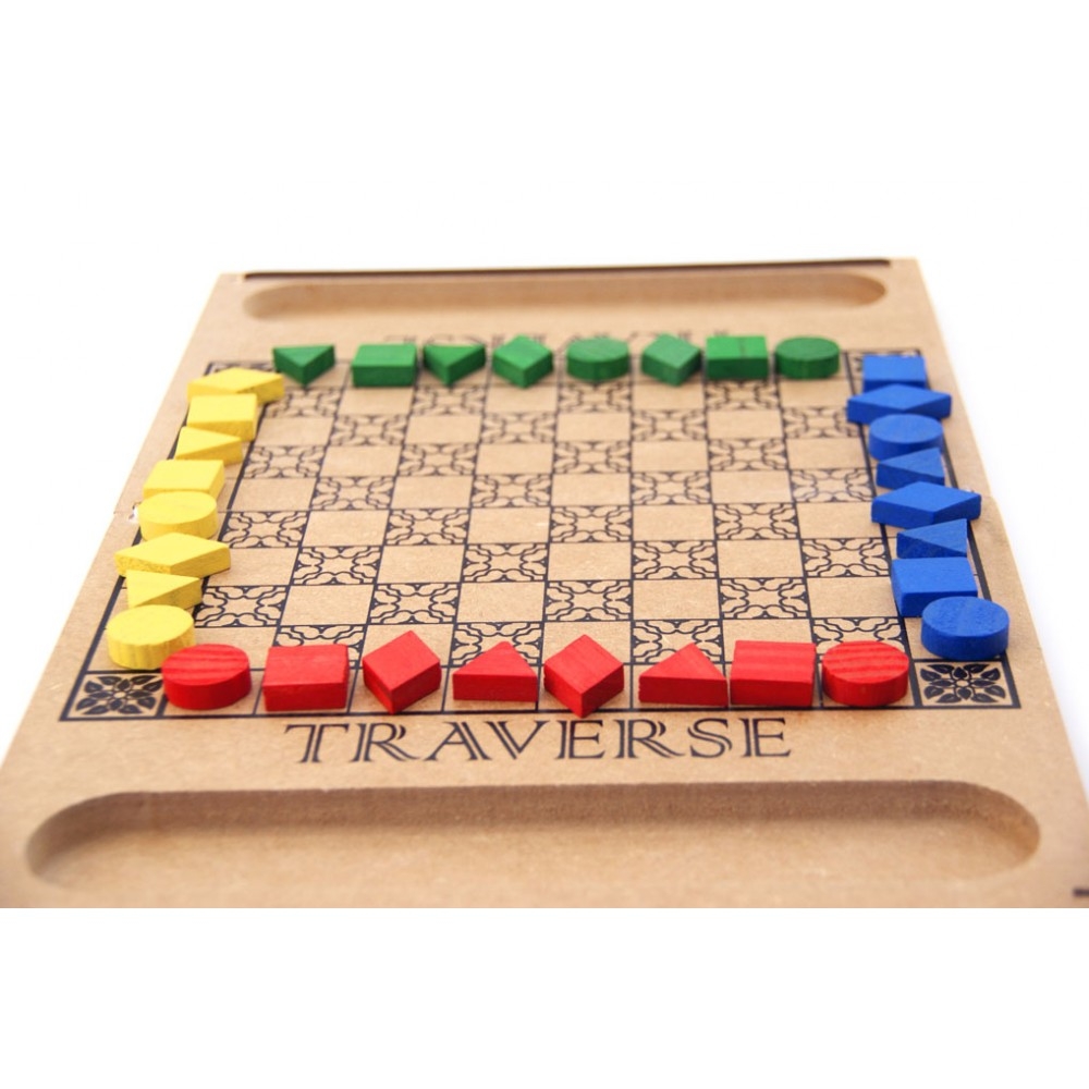 Joga-se Traverse num tabuleiro similar ao de damas. Cada jogador escolhe uma cor de peças, sendo que cada um tem oito delas: dois quadrados, dois losangos, dois triângulos e dois círculos. Os jogadores organizam suas peças em um dos quatro lados iniciais do tabuleiro, em qualquer ordem, e devem chegar com todas as peças do lado oposto do tabuleiro. As peças se movem de modos diferentes de acordo com sua forma: