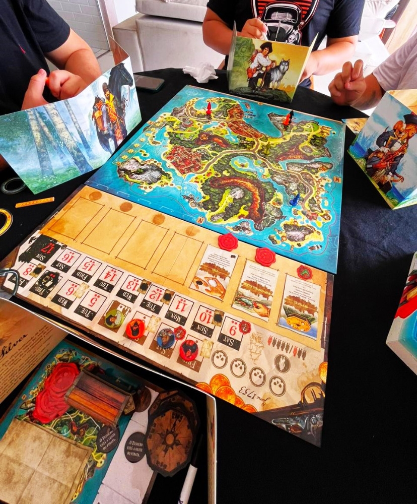 Jogo em Andamento - Tauleiro, biombos, baú do tesouro.