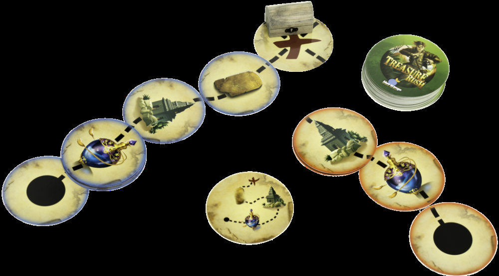 Cada jogador de Treasure Rush possui um conjunto de seis cartas de aventuras de dois lados, e eles precisam usar essas cartas para encontrar o tesouro antes de todos.
