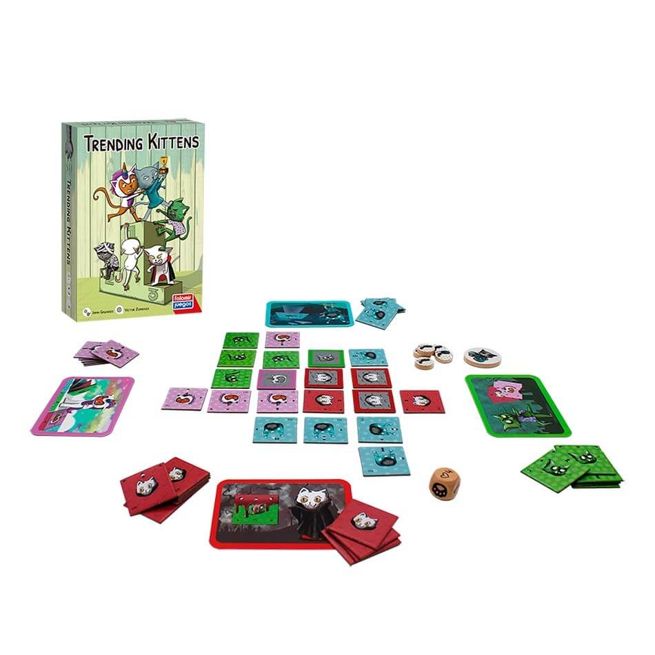 48 losetas, 4 cartas de gatos, 1 ficha de jogador inicial, 5 fichas de vitória, 1 dado e regras do jogo.