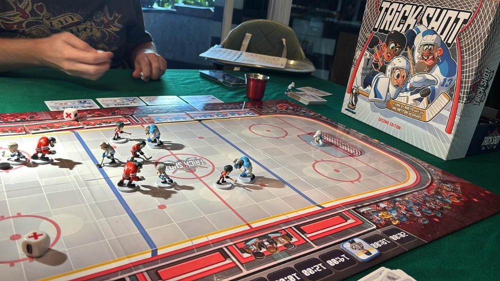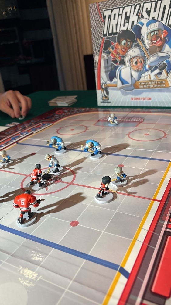 Trick Shot Second Edition é um jogo de hóquei no gelo tenso, tático e rápido com miniaturas de plástico legais e um conjunto de regras simplificado. O jogo atinge um equilíbrio perfeito entre sorte e estratégia, ao mesmo tempo em que é fácil de explicar e chegar à mesa. Use posicionamento inteligente, habilidades especiais dos seus patinadores e pressione a sorte para superar seu oponente e marcar mais gols.