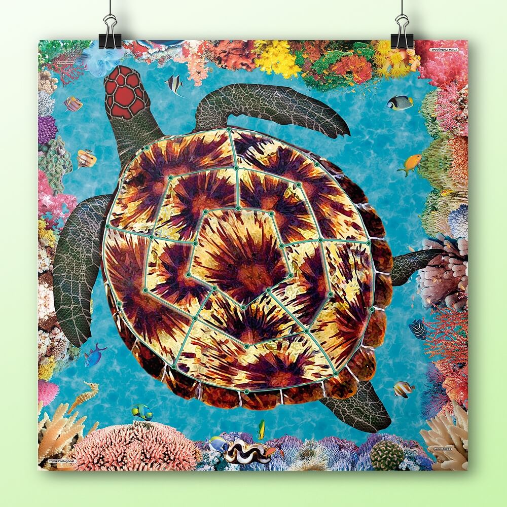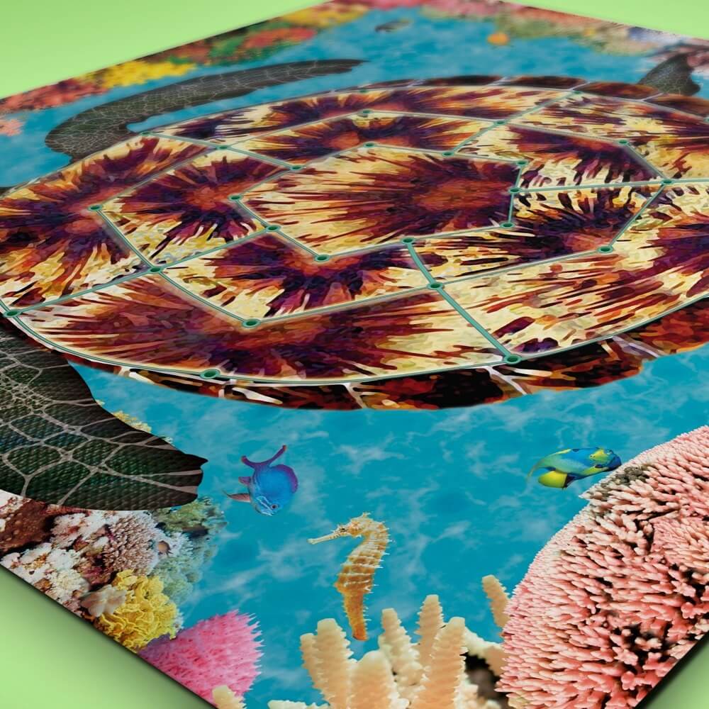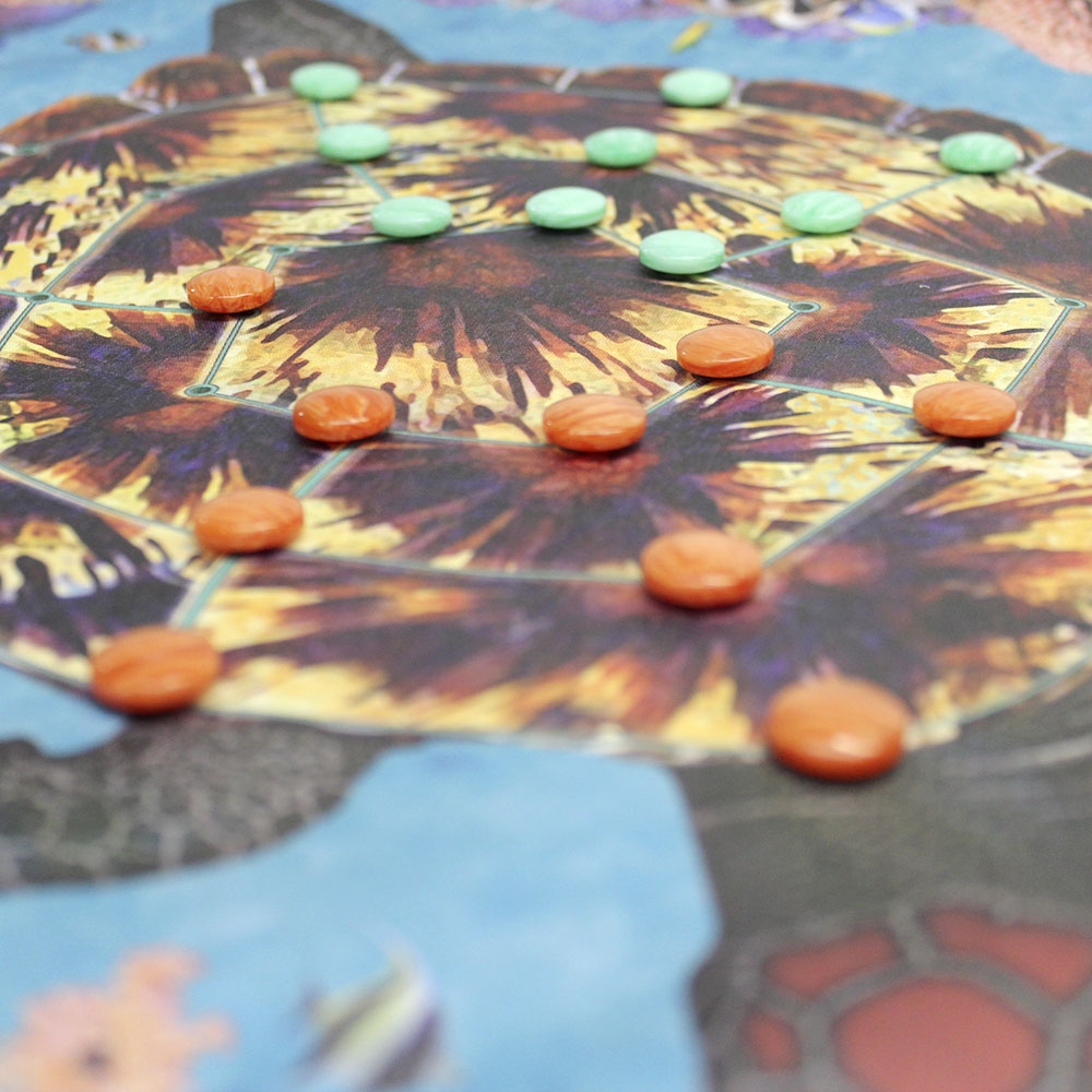 Neste jogo da coleção Ludens Planet, o tabuleiro pentagonal é representado no casco da tartaruga marítima, espécie protegida e distribuída ao longo da costa brasileira.