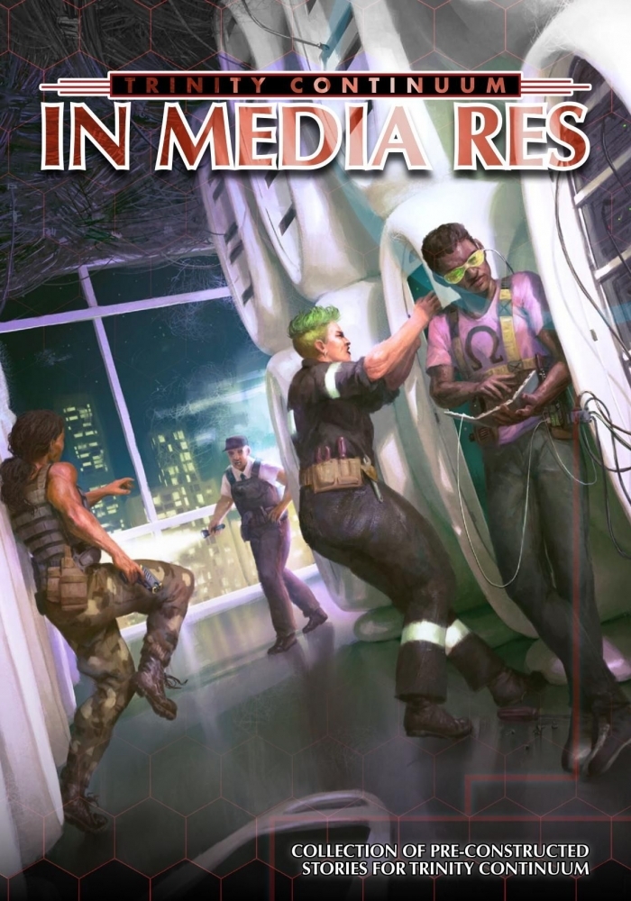 TRINITY: IN MEDIA RES é uma coleção de histórias pré-construídas para TRINITY CONTINUUM, cada uma centrada em Talentos - indivíduos hipercompetentes com habilidades incríveis e uma grande dose de sorte cujas vidas parecem sempre se revezar para o excitante. Os guias de história podem usar essas aventuras prontas para começar uma nova campanha com um estrondo, tecer como uma história intersticial ou modificar para se adequar aos seus próprios jogos em andamento.