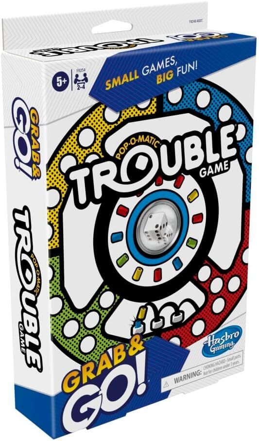 VERSÃO PORTÁTIL DO TROUBLE: Jogabilidade clássica em formato de bolso. O jogo Trouble Grab and Go é uma versão de bolso no jogo clássico Trouble
