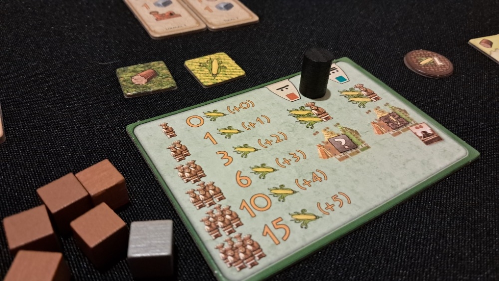 65 cubos de madeira que representam recursos (madeira, pedra e ouro)
