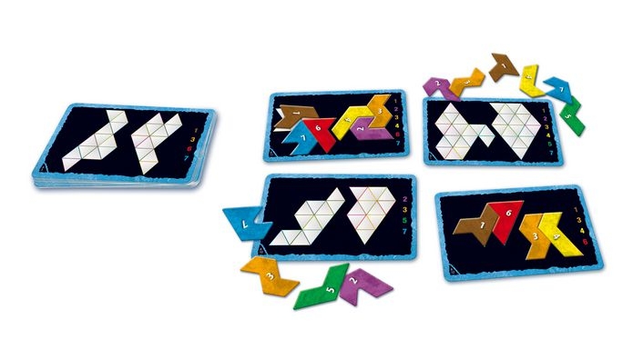 Uma variação do Ubongo: Das Kartenspiel. Use as peças semelhantes as do "Tangram" para completar as silhuetas nas cartas primeiro que seus adversários para conseguir pontos e ganhar o jogo! Versão Pocket (Travel).